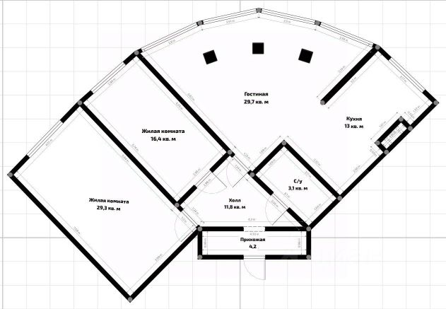 Большой холл - 26 кв.м., просторная гостиная 26.6 кв.м., с выходом на балкон, кухня 22.7 кв.м., с панорамным окном и две спальни по 17.1 и 12.7 кв.м., раздельный сан.узел, высокие потолки 3.10 м.
