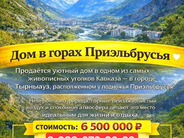 Продается уютный дом,с хорошим ремонтом в Эльбрусском районе у подножия горы Эльбрус. Дом состоит из пяти комнат, кухни ,кательной, кладовой . Два входа в дом. В доме ремонт из качественных материалов. Санузел в доме. В подарок покупателю остается вся мебель. Разумный торг реальному покупателю. Имеется свой риэлтор.