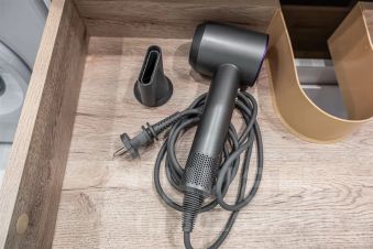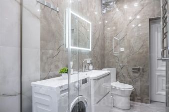 — душ, стиральная машина, фен, утюг, гладильная доска, тапочки, сушилка, шампунь, мыло.