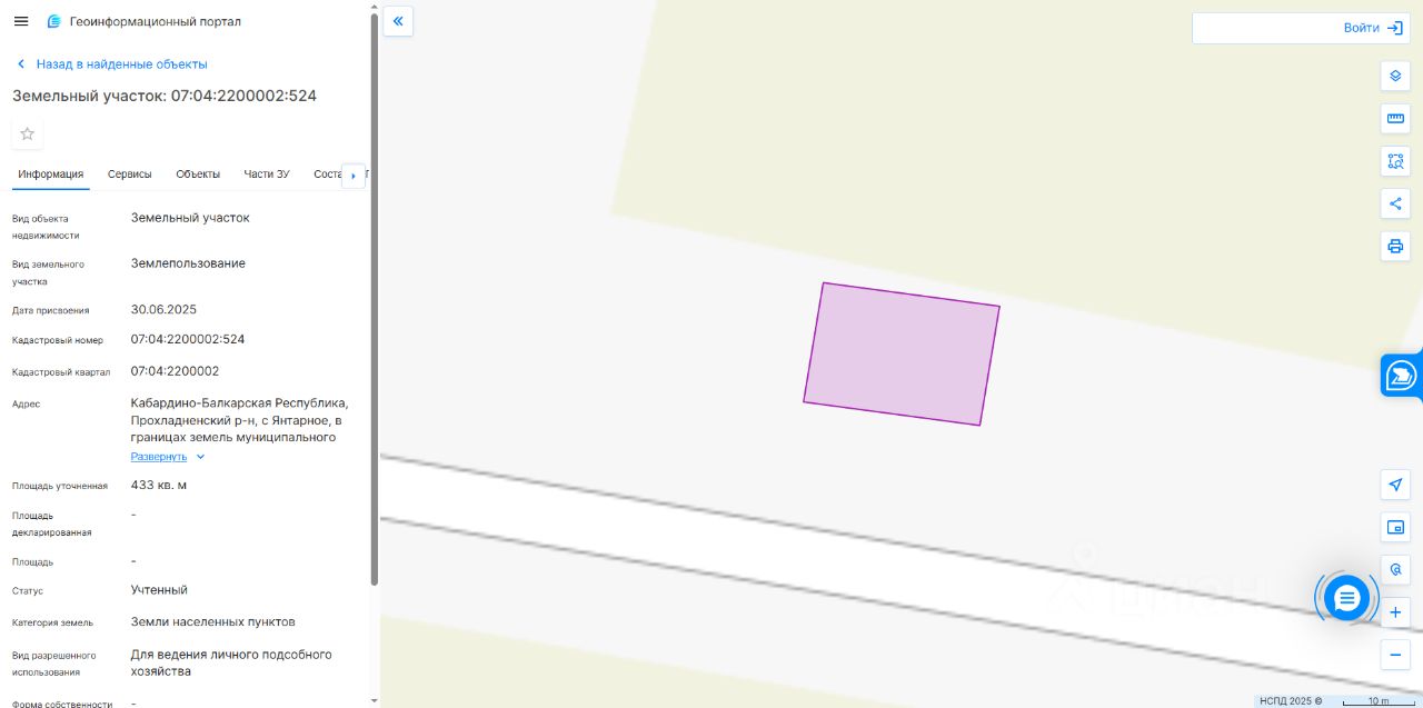 земельный участок, расположенный в КБР, р-н Прохладненский, с. Янтарное в границах земель муниципального образования. кадастровый номер земельного участка 07:04:2200002:524; площадь земельного участка 433 кв. м.; категория земель земли населенных пунктов; разрешенное использование Для ведения личного подсобного хозяйства