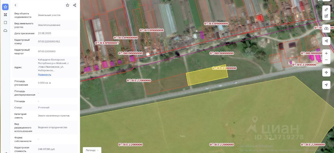 земельный участок из земель населенных пунктов с кадастровым номером 07:03:2200000:162, площадью 3000 кв.м, видом разрешенного использования "ведение огородничества", расположенный по адресу: Кабардино-Балкарская Республика, Майский район, с. Ново-Ивановское, ул. Набережная, д. 38
