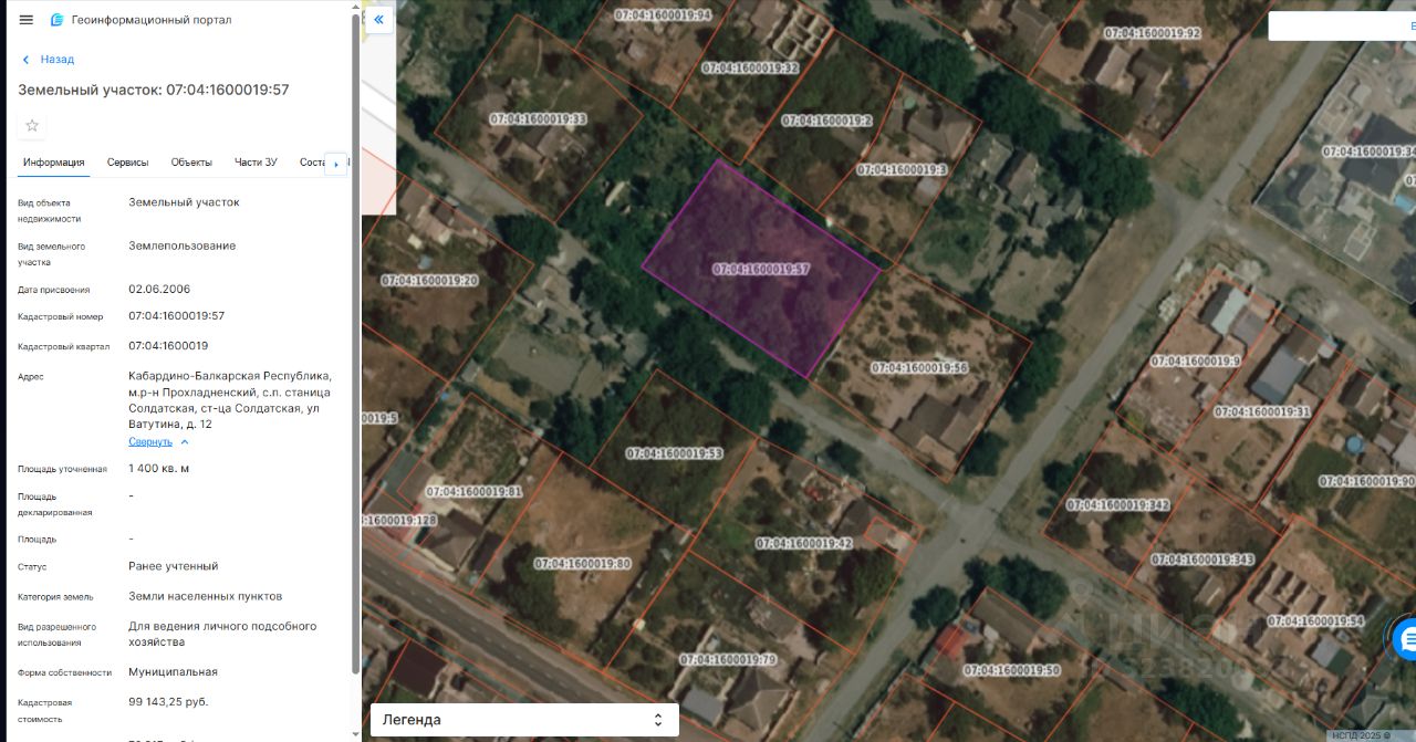 Земельный участок, расположенный по адресу: КБР, Прохладненский район, ст. Солдатская, ул. Ватутина, д.12; Кадастровый номер земельного участка - 07:04:1600019:57; Площадь земельного участка - 1400 кв.м.; Категория земель - земли населенных пунктов; Вид разрешенного использования - для ведения личного подсобного хозяйства.