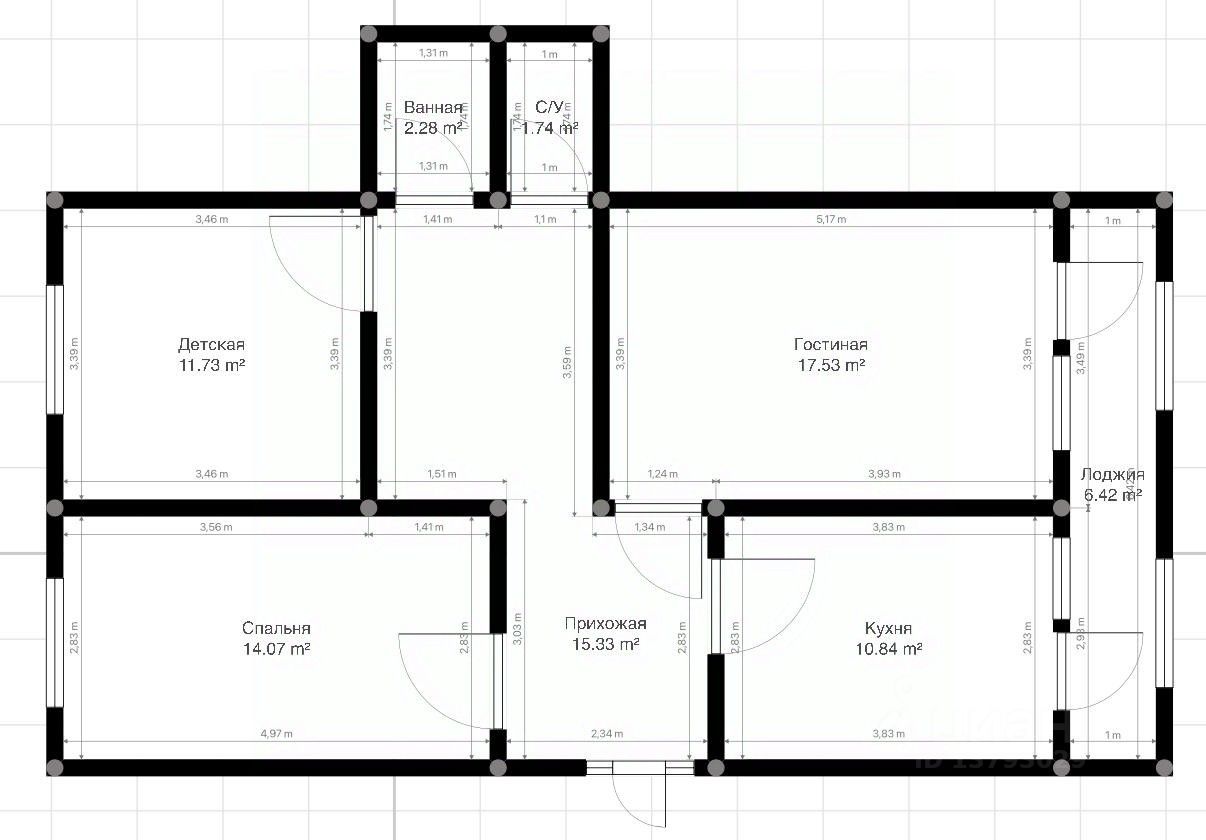 Общая площадь квартиры составляет 74 м2