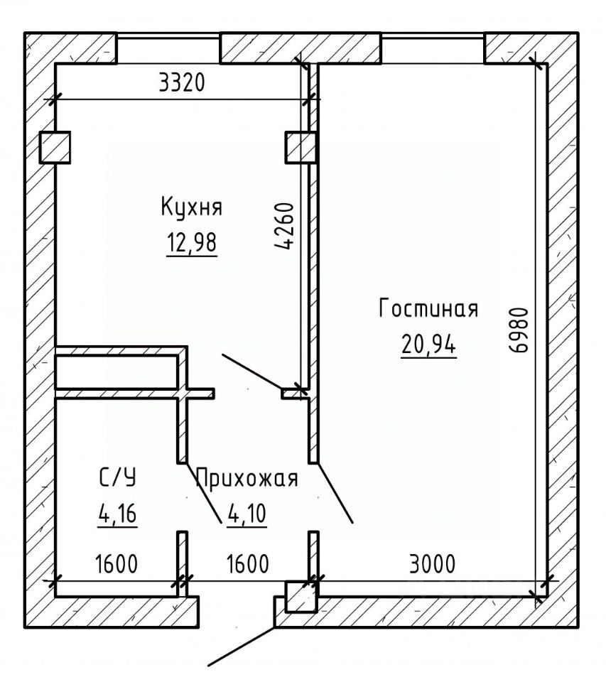 Общая площадь 43 м2, комната и кухня правильной формы, хороших размеров.