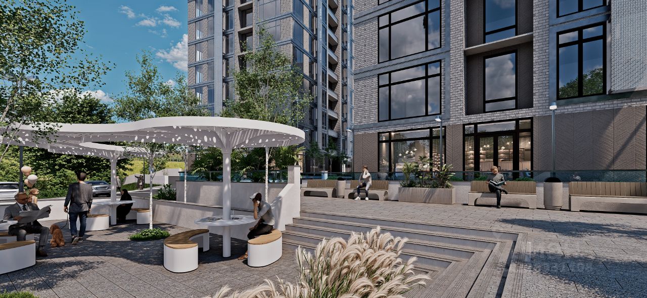 Благоустройство придомовой территории, включающее в себя организацию, детской и спортивной площадки, озеленение, высадка деревьев и скамейки.