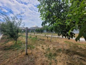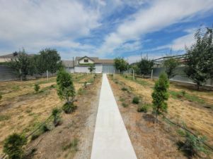 Большой сад с аллеей из хвойных деревьев и различными фруктовыми деревьями.