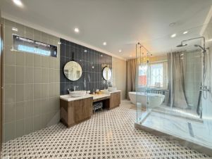 Этот уютный и современный дом площадью 450 кв.м., включая цокольный этаж, расположен на просторном участке площадью 10,75 соток, что обеспечивает комфорт и уединение для всей семьи.