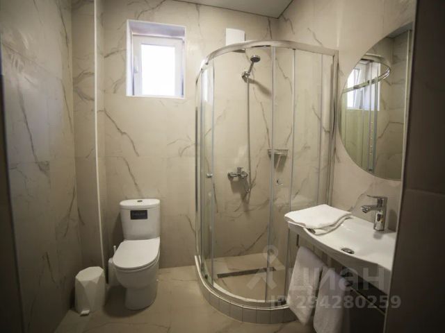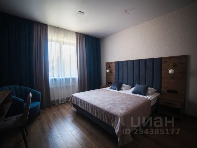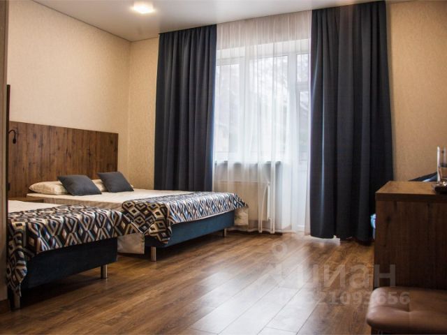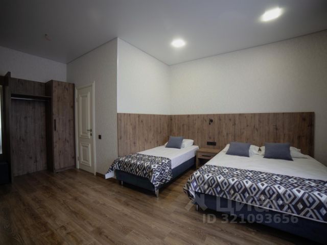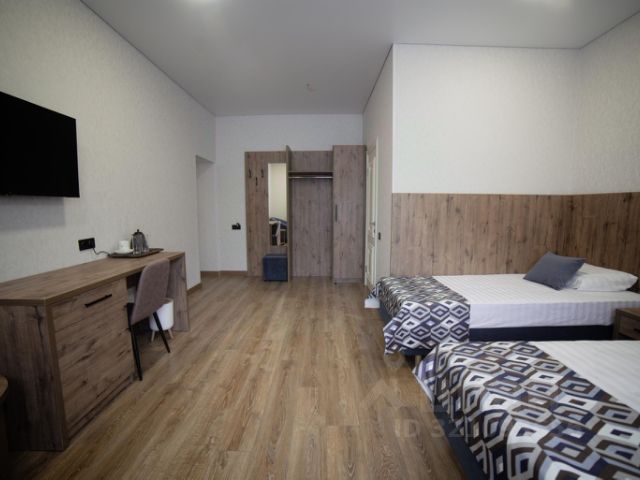 Номер 25м2, со второго этажа имеются балконы, в комнате расположена большая двуспальная кровать с ортопедическим матрасом, также есть номера с двумя односпальными кроватями, две прикроватные тумбочки, раскладной диван, телевизор, стол с тумбой, два стула, мини-холодильник, чайник, обогреватель, в прихожей шкаф с зеркалом, сейф, в санузле ванна, унитаз, раковина, зеркало с подсветкой, змеевик, фен.