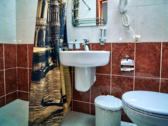 В ванной: туалет, раковина, душ, средства личной гигиены, халат, тапочки, фен, зеркало, набор полотенец.