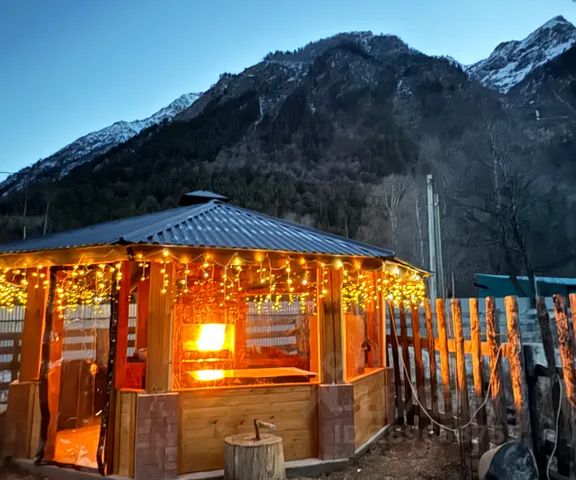 Дом в этническом стиле оснащен односпальными кроватями, есть удобные диваны и кресла. В спальной комнате установлен стильный камин и домашний кинотеатр-проектор. В ней 5 спальных мест, можно установить дополнительные кровати. Санузел, кухня-столовая и прихожая в доме отдельные. Для приготовления еды имеется отдельная кухня, гарнитур в ней оснащен плитой, холодильником, чайником. Есть возможность пользоваться стиральной машиной, кухонными принадлежностями, посудой и столовыми приборами, отдельной зоной барбекю.